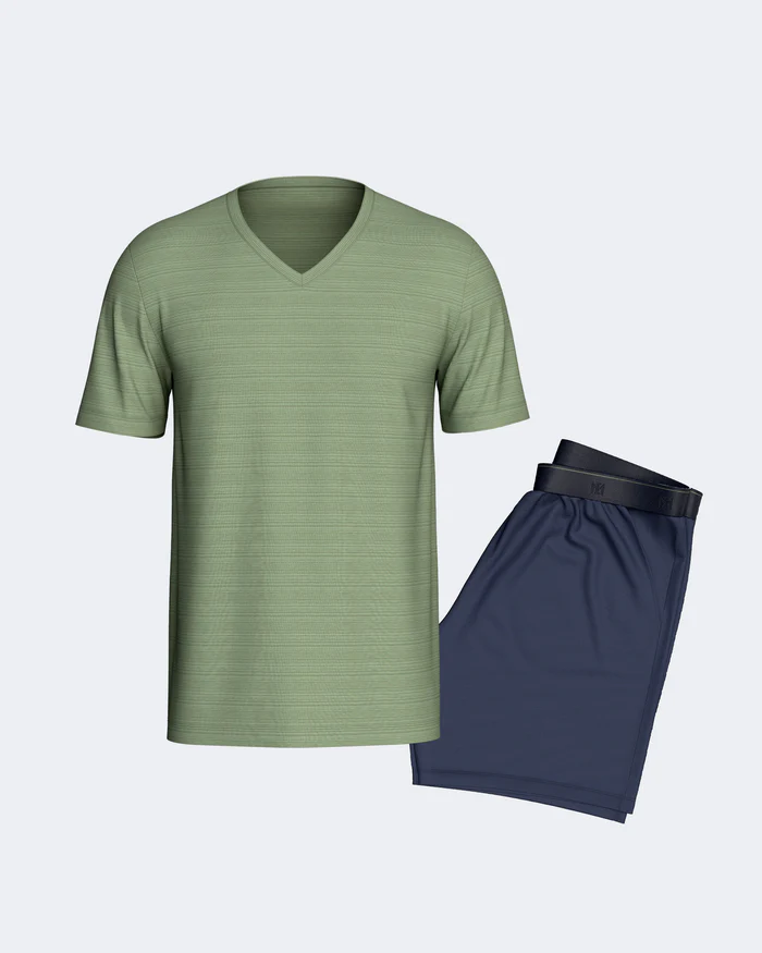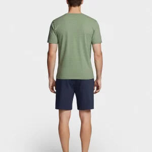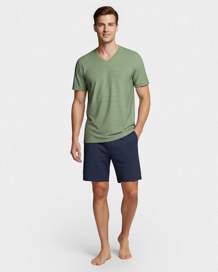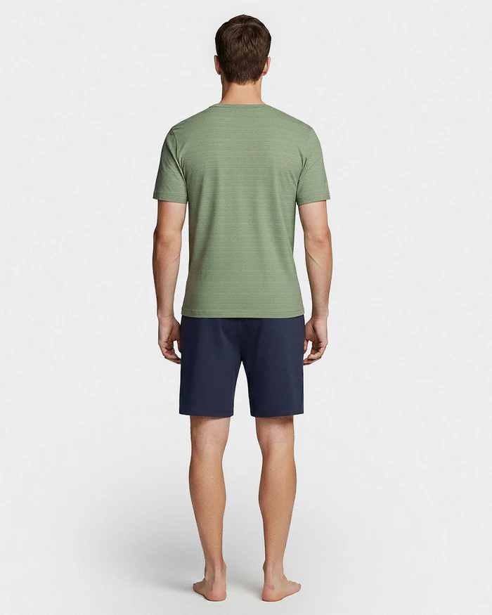 Pijama curto composto por camisola gola em V de manga curta com padrão de linhas finas e calções curtos lisos com bolsos laterais. Produzido com fibra TENCEL ™ Modal. As fibras TENCEL ™ Modal são naturalmente macias e suaves ao toque.