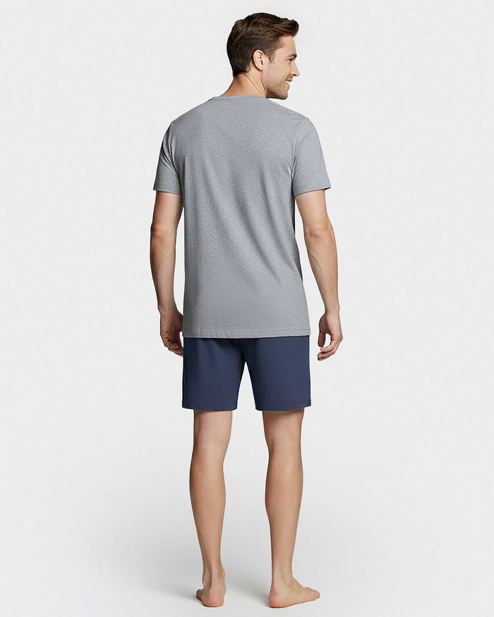 Pijama curto em algodão, composto por t-shirt gola em V com logotipo estampado e calções lisos com cintura elástica e bolsos laterais. Malha suave 100% Algodão. Produzido em Portugal.